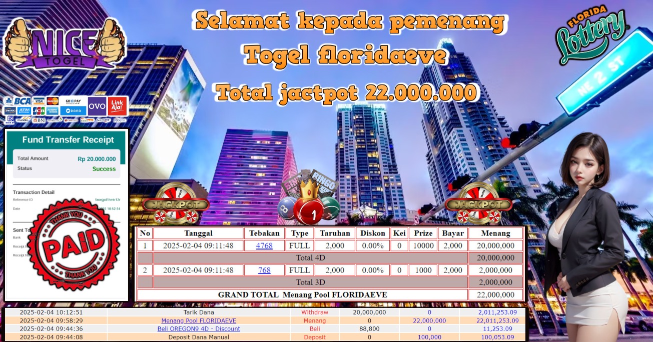 Selamat kepada User id : AWERT** Telah berhasil mendapatkan kemenangan besar pada permainan TOGEL FLORIDA EVE Dengan kemenangan Sebesar Rp.22.000.000,- Setelah mengisi formulir withdraw dengan kurung waktu hanya 5 – 10 menit pihak NICETOGEL sudah melakukan transfer kepada pemilik Userid dan dana sudah dapat di cairkan oleh pemenang. Bukti pembayaran yang kami berikan merupakan bukti pembayaran yang SAH / VALID yang langung di dapatkan melaui tanda transfer transaksi dari Bank yang di tuju.