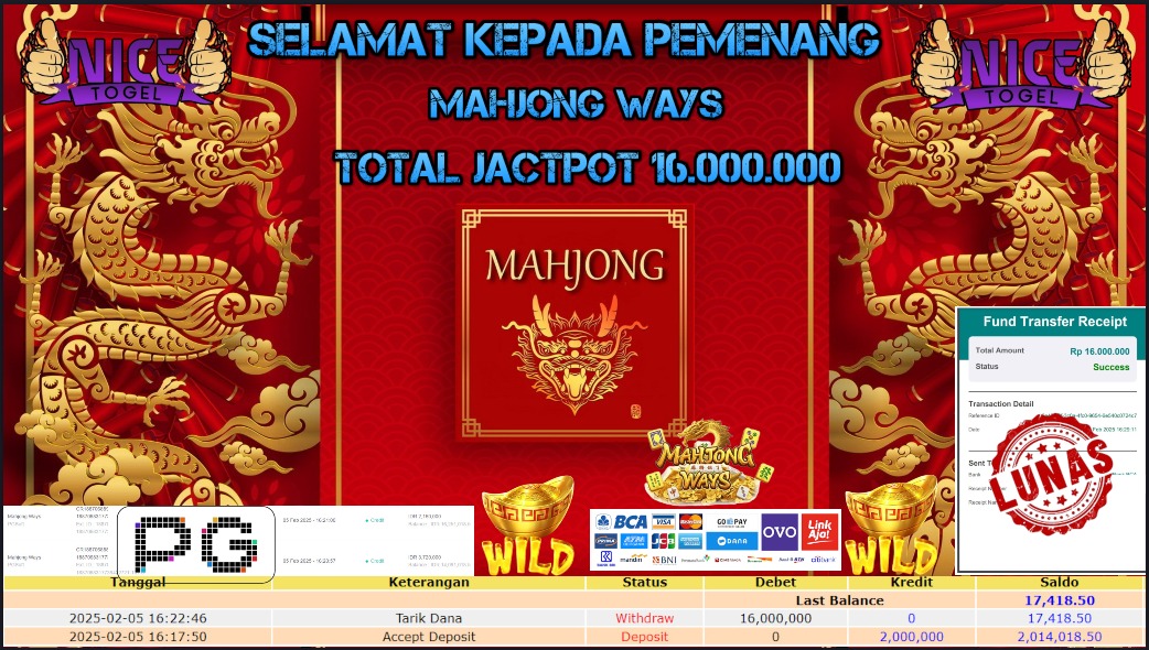 Selamat kepada User id : Asdrr** Telah berhasil mendapatkan kemenangan besar pada permainan SLOT MAHJONG WAYS Dengan kemenangan Sebesar Rp.16.000.000,- Setelah mengisi formulir withdraw dengan kurung waktu hanya 5 – 10 menit pihak NICETOGEL sudah melakukan transfer kepada pemilik Userid dan dana sudah dapat di cairkan oleh pemenang. Bukti pembayaran yang kami berikan merupakan bukti pembayaran yang SAH / VALID yang langung di dapatkan melaui tanda transfer transaksi dari Bank yang di tuju.