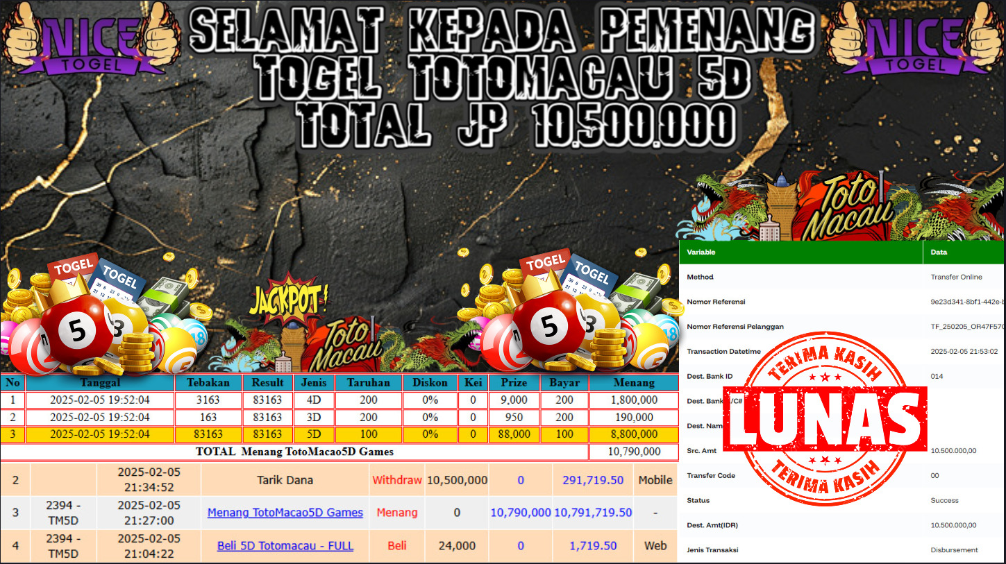 Selamat kepada User id : asia** Telah berhasil mendapatkan kemenangan besar pada permainan TOGEL TOTOMACAU 5D Dengan kemenangan Sebesar Rp10.500.000,- Setelah mengisi formulir withdraw dengan kurung waktu hanya 5 – 10 menit pihak NICETOGEL sudah melakukan transfer kepada pemilik Userid dan dana sudah dapat di cairkan oleh pemenang. Bukti pembayaran yang kami berikan merupakan bukti pembayaran yang SAH / VALID yang langung di dapatkan melaui tanda transfer transaksi dari Bank yang di tuju.