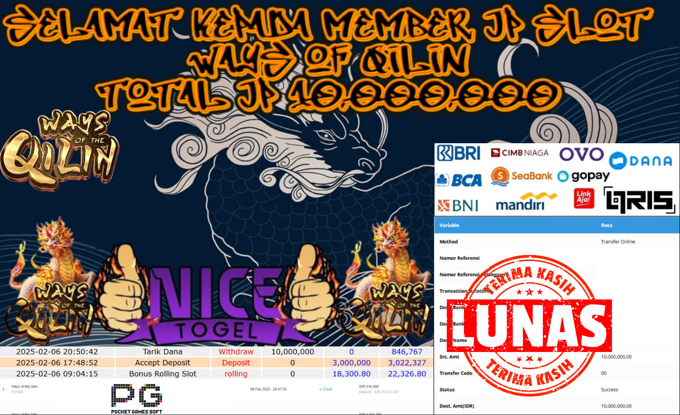 Selamat kepada User id : yesu** Telah berhasil mendapatkan kemenangan besar pada permainan SLOT WAYS OF QILIN Dengan kemenangan Sebesar Rp.10.000.000,- Setelah mengisi formulir withdraw dengan kurung waktu hanya 5 – 10 menit pihak NICETOGEL sudah melakukan transfer kepada pemilik Userid dan dana sudah dapat di cairkan oleh pemenang. Bukti pembayaran yang kami berikan merupakan bukti pembayaran yang SAH / VALID yang langung di dapatkan melaui tanda transfer transaksi dari Bank yang di tuju.