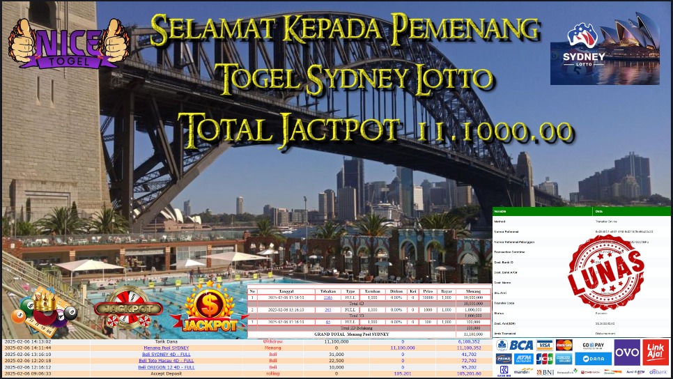 Selamat kepada User id : Casmi** Telah berhasil mendapatkan kemenangan besar pada permainan TOGEL SYDNEY LOTTO Dengan kemenangan Sebesar Rp.11.100.000,- Setelah mengisi formulir withdraw dengan kurung waktu hanya 5 – 10 menit pihak NICETOGEL sudah melakukan transfer kepada pemilik Userid dan dana sudah dapat di cairkan oleh pemenang. Bukti pembayaran yang kami berikan merupakan bukti pembayaran yang SAH / VALID yang langung di dapatkan melaui tanda transfer transaksi dari Bank yang di tuju.