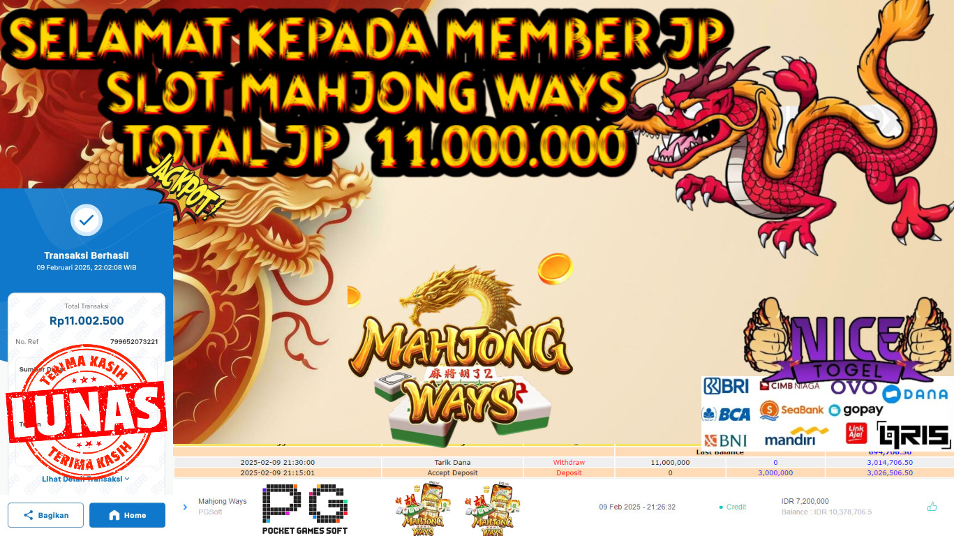 Selamat kepada User id : SIA0** Telah berhasil mendapatkan kemenangan besar pada permainan SLOT MAHJONG WAYS 1000 Dengan kemenangan Sebesar Rp.11.000.000,- Setelah mengisi formulir withdraw dengan kurung waktu hanya 5 – 10 menit pihak NICETOGEL sudah melakukan transfer kepada pemilik Userid dan dana sudah dapat di cairkan oleh pemenang. Bukti pembayaran yang kami berikan merupakan bukti pembayaran yang SAH / VALID yang langung di dapatkan melaui tanda transfer transaksi dari Bank yang di tuju.