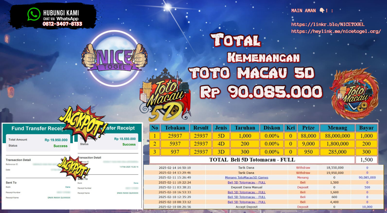 Selamat kepada member NICETOGEL User id : Juloa** Telah berhasil mendapatkan kemenangan besar pada permainan TOGEL TOTO MACAU 5D Dengan kemenangan Sebesar Rp.90.085.000,- Setelah mengisi formulir withdraw dengan kurung waktu hanya 5 – 10 menit pihak NICETOGEL sudah melakukan transfer kepada pemilik Userid dan dana sudah dapat di cairkan oleh pemenang. Bukti pembayaran yang kami berikan merupakan bukti pembayaran yang SAH / VALID yang langung di dapatkan melaui tanda transfer transaksi dari Bank yang di tuju.