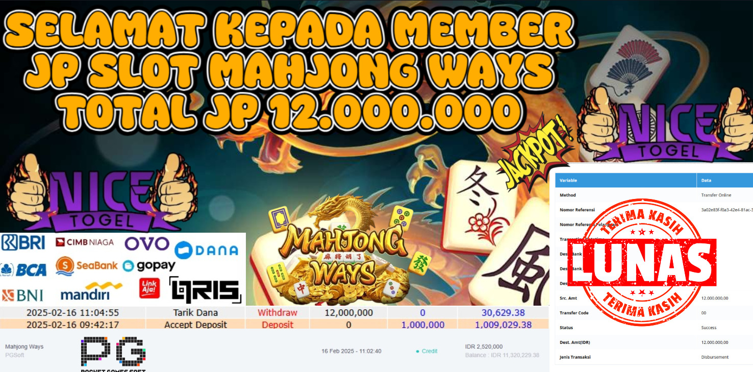 Selamat kepada member NICETOGEL User id : uoia** Telah berhasil mendapatkan kemenangan besar pada permainan SLOT MAHJONG WAYS Dengan kemenangan Sebesar Rp.12.000.000,- Setelah mengisi formulir withdraw dengan kurung waktu hanya 5 – 10 menit pihak NICETOGEL sudah melakukan transfer kepada pemilik Userid dan dana sudah dapat di cairkan oleh pemenang. Bukti pembayaran yang kami berikan merupakan bukti pembayaran yang SAH / VALID yang langung di dapatkan melaui tanda transfer transaksi dari Bank yang di tuju.