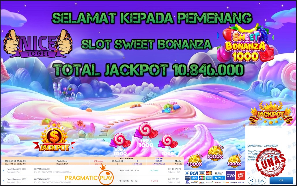 Selamat kepada member NICETOGEL User id : Asde** Telah berhasil mendapatkan kemenangan besar pada permainan SLOT SWEET BONANZA 1000 Dengan kemenangan Sebesar Rp.10.846.000,- Setelah mengisi formulir withdraw dengan kurung waktu hanya 5 – 10 menit pihak NICETOGEL sudah melakukan transfer kepada pemilik Userid dan dana sudah dapat di cairkan oleh pemenang. Bukti pembayaran yang kami berikan merupakan bukti pembayaran yang SAH / VALID yang langung di dapatkan melaui tanda transfer transaksi dari Bank yang di tuju.