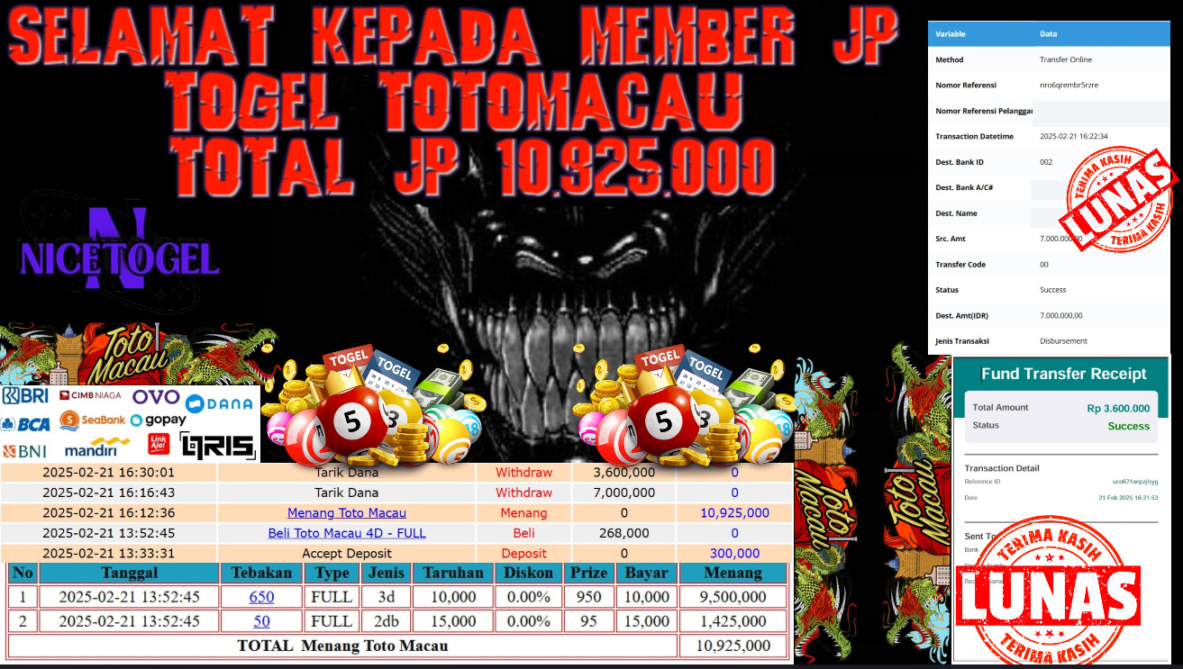 Selamat kepada member NICETOGEL User id : Puioa** Telah berhasil mendapatkan kemenangan besar pada permainan TOGEL TOTO MACAU Dengan kemenangan Sebesar Rp.10.925.000,- Setelah mengisi formulir withdraw dengan kurung waktu hanya 5 – 10 menit pihak NICETOGEL sudah melakukan transfer kepada pemilik Userid dan dana sudah dapat di cairkan oleh pemenang. Bukti pembayaran yang kami berikan merupakan bukti pembayaran yang SAH / VALID yang langung di dapatkan melaui tanda transfer transaksi dari Bank yang di tuju.