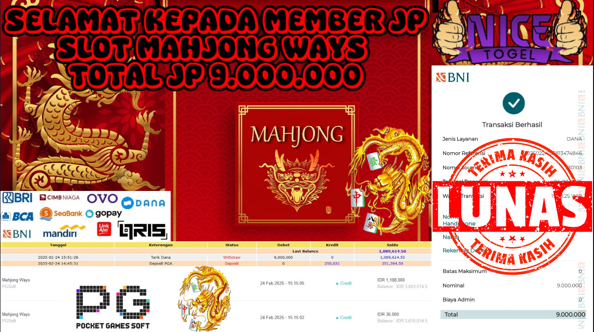 Selamat kepada member NICETOGEL User id : Werta** Telah berhasil mendapatkan kemenangan besar pada permainan SLOT MAHJONG WAYS Dengan kemenangan Sebesar Rp.9.000.000,- Setelah mengisi formulir withdraw dengan kurung waktu hanya 5 – 10 menit pihak NICETOGEL sudah melakukan transfer kepada pemilik Userid dan dana sudah dapat di cairkan oleh pemenang. Bukti pembayaran yang kami berikan merupakan bukti pembayaran yang SAH / VALID yang langung di dapatkan melaui tanda transfer transaksi dari Bank yang di tuju.