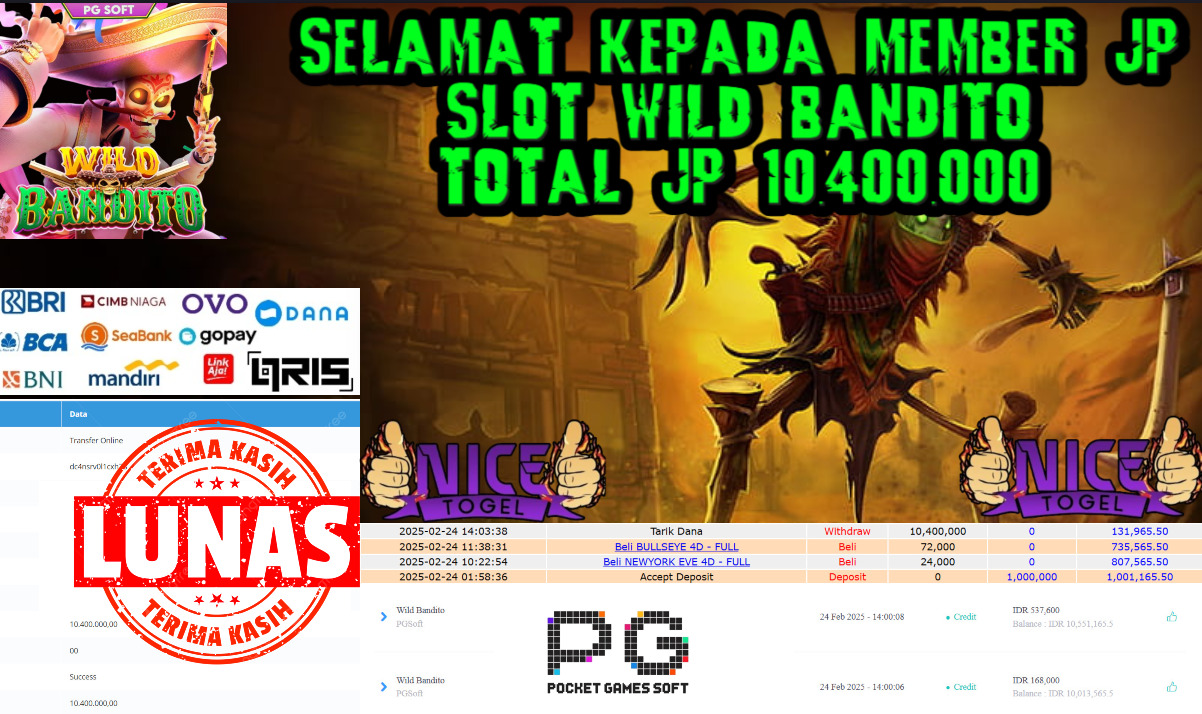 Selamat kepada member NICETOGEL User id : Eryt** Telah berhasil mendapatkan kemenangan besar pada permainan BUKTI JACKPOT SLOT WILD BANDITO Rp 10.400.000,- LUNAS Dengan kemenangan Sebesar Rp.9.000.000,- Setelah mengisi formulir withdraw dengan kurung waktu hanya 5 – 10 menit pihak NICETOGEL sudah melakukan transfer kepada pemilik Userid dan dana sudah dapat di cairkan oleh pemenang. Bukti pembayaran yang kami berikan merupakan bukti pembayaran yang SAH / VALID yang langung di dapatkan melaui tanda transfer transaksi dari Bank yang di tuju.