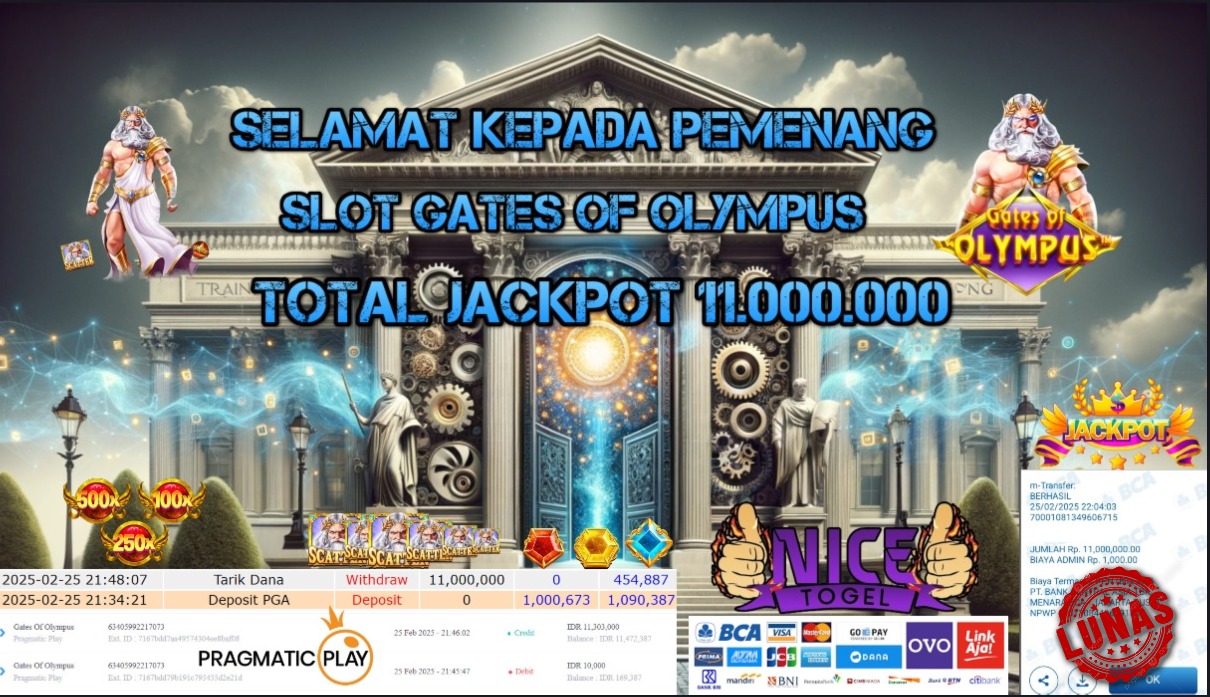 Selamat kepada member NICETOGEL User id : Yuio0** Telah berhasil mendapatkan kemenangan besar pada permainan SLOT GATES OF OLYMPUS Dengan kemenangan Sebesar Rp.11.000.000,- Setelah mengisi formulir withdraw dengan kurung waktu hanya 5 – 10 menit pihak NICETOGEL sudah melakukan transfer kepada pemilik Userid dan dana sudah dapat di cairkan oleh pemenang. Bukti pembayaran yang kami berikan merupakan bukti pembayaran yang SAH / VALID yang langung di dapatkan melaui tanda transfer transaksi dari Bank yang di tuju.