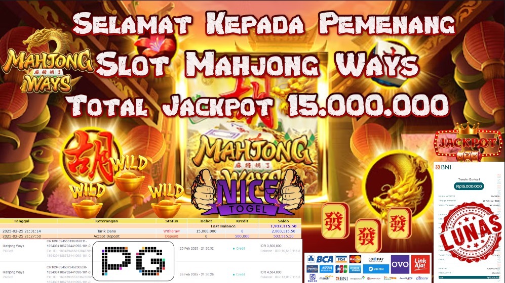 Selamat kepada member NICETOGEL User id : Mak588** Telah berhasil mendapatkan kemenangan besar pada permainan SLOT MAHJONG WAYS Dengan kemenangan Sebesar Rp.15.000.000,- Setelah mengisi formulir withdraw dengan kurung waktu hanya 5 – 10 menit pihak NICETOGEL sudah melakukan transfer kepada pemilik Userid dan dana sudah dapat di cairkan oleh pemenang. Bukti pembayaran yang kami berikan merupakan bukti pembayaran yang SAH / VALID yang langung di dapatkan melaui tanda transfer transaksi dari Bank yang di tuju.