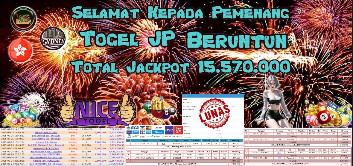 Selamat kepada member NICETOGEL User id : Poae** Telah berhasil mendapatkan kemenangan besar pada permainan TOGEL BERUNTUN SYDNEY LOTTO,TOTOMACAU,& HONGKONG LOTTO Dengan kemenangan Sebesar Rp.15.570.000,- Setelah mengisi formulir withdraw dengan kurung waktu hanya 5 – 10 menit pihak NICETOGEL sudah melakukan transfer kepada pemilik Userid dan dana sudah dapat di cairkan oleh pemenang. Bukti pembayaran yang kami berikan merupakan bukti pembayaran yang SAH / VALID yang langung di dapatkan melaui tanda transfer transaksi dari Bank yang di tuju.
