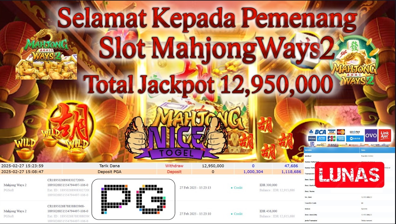 Selamat kepada member NICETOGEL User id : Leppa** Telah berhasil mendapatkan kemenangan besar pada permainan SLOT MAHJONG WAYS 2 Dengan kemenangan Sebesar Rp.12.950.000,- Setelah mengisi formulir withdraw dengan kurung waktu hanya 5 – 10 menit pihak NICETOGEL sudah melakukan transfer kepada pemilik Userid dan dana sudah dapat di cairkan oleh pemenang. Bukti pembayaran yang kami berikan merupakan bukti pembayaran yang SAH / VALID yang langung di dapatkan melaui tanda transfer transaksi dari Bank yang di tuju.