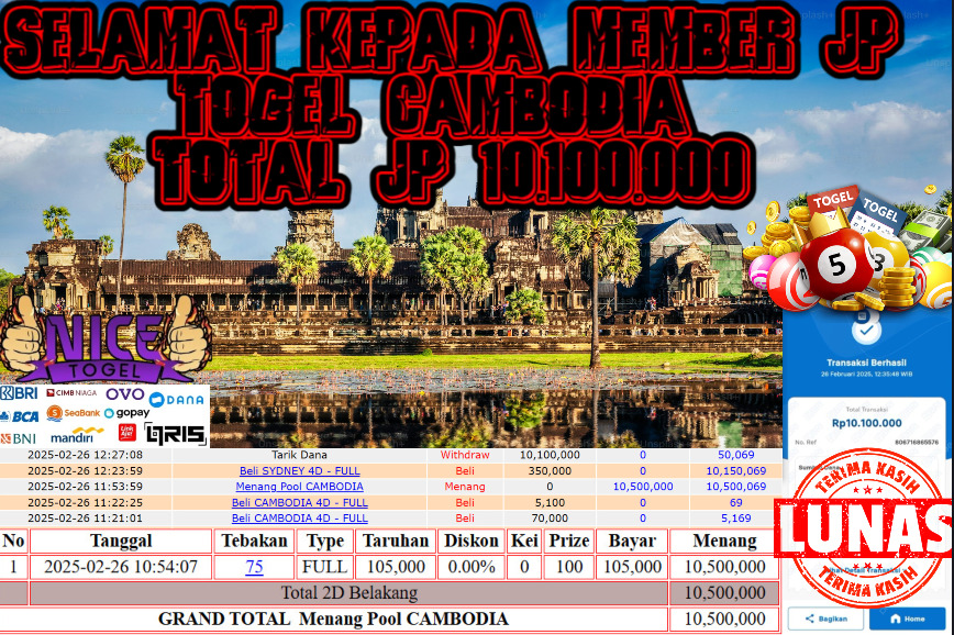 Selamat kepada member NICETOGEL User id : Yuia** Telah berhasil mendapatkan kemenangan besar pada permainan TOGEL CAMBODIA Dengan kemenangan Sebesar Rp.10.100.000,- Setelah mengisi formulir withdraw dengan kurung waktu hanya 5 – 10 menit pihak NICETOGEL sudah melakukan transfer kepada pemilik Userid dan dana sudah dapat di cairkan oleh pemenang. Bukti pembayaran yang kami berikan merupakan bukti pembayaran yang SAH / VALID yang langung di dapatkan melaui tanda transfer transaksi dari Bank yang di tuju.
