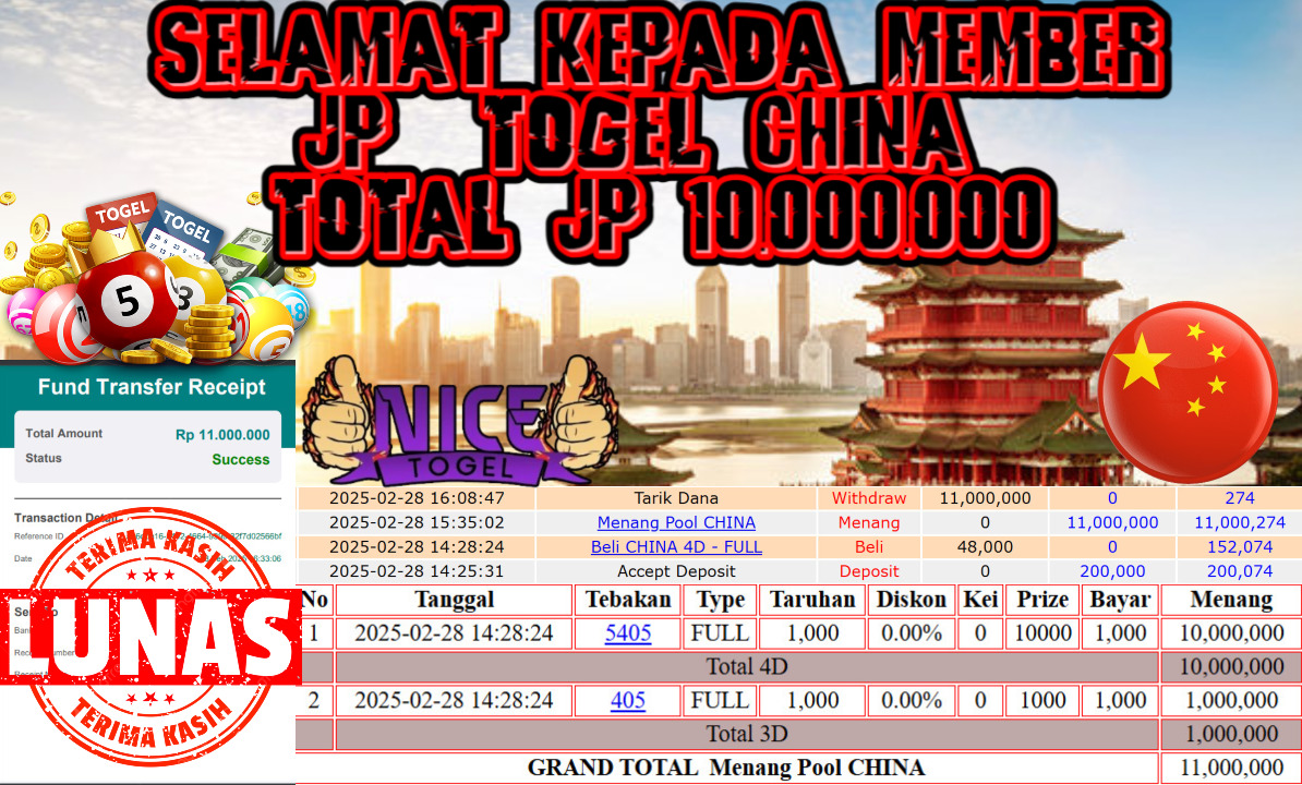 Selamat kepada member NICETOGEL User id : AIB** Telah berhasil mendapatkan kemenangan besar pada permainan TOGEL CHINA Dengan kemenangan Sebesar Rp.11.000.000,- Setelah mengisi formulir withdraw dengan kurung waktu hanya 5 – 10 menit pihak NICETOGEL sudah melakukan transfer kepada pemilik Userid dan dana sudah dapat di cairkan oleh pemenang. Bukti pembayaran yang kami berikan merupakan bukti pembayaran yang SAH / VALID yang langung di dapatkan melaui tanda transfer transaksi dari Bank yang di tuju.