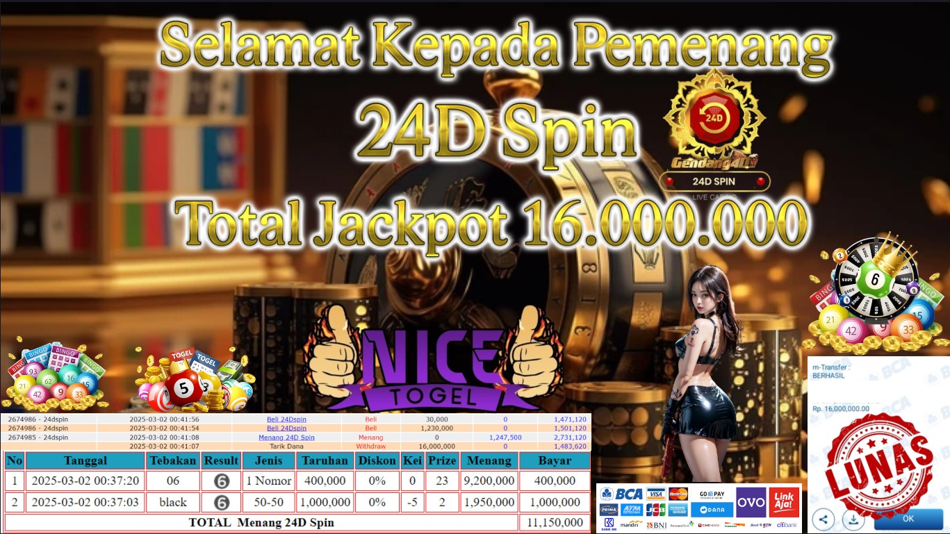 Selamat kepada member NICETOGEL User id : Opea52** Telah berhasil mendapatkan kemenangan besar pada permainan LIVE 24D SPIN Dengan kemenangan Sebesar Rp.16.000.000,- Setelah mengisi formulir withdraw dengan kurung waktu hanya 5 – 10 menit pihak NICETOGEL sudah melakukan transfer kepada pemilik Userid dan dana sudah dapat di cairkan oleh pemenang. Bukti pembayaran yang kami berikan merupakan bukti pembayaran yang SAH / VALID yang langung di dapatkan melaui tanda transfer transaksi dari Bank yang di tuju.