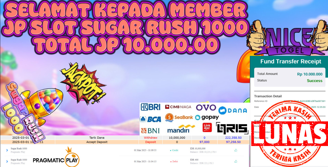 Selamat kepada member NICETOGEL User id : Weart** Telah berhasil mendapatkan kemenangan besar pada permainan SLOT SUGAR RUSH 1000 Dengan kemenangan Sebesar Rp.10.000.000,- Setelah mengisi formulir withdraw dengan kurung waktu hanya 5 – 10 menit pihak NICETOGEL sudah melakukan transfer kepada pemilik Userid dan dana sudah dapat di cairkan oleh pemenang. Bukti pembayaran yang kami berikan merupakan bukti pembayaran yang SAH / VALID yang langung di dapatkan melaui tanda transfer transaksi dari Bank yang di tuju.