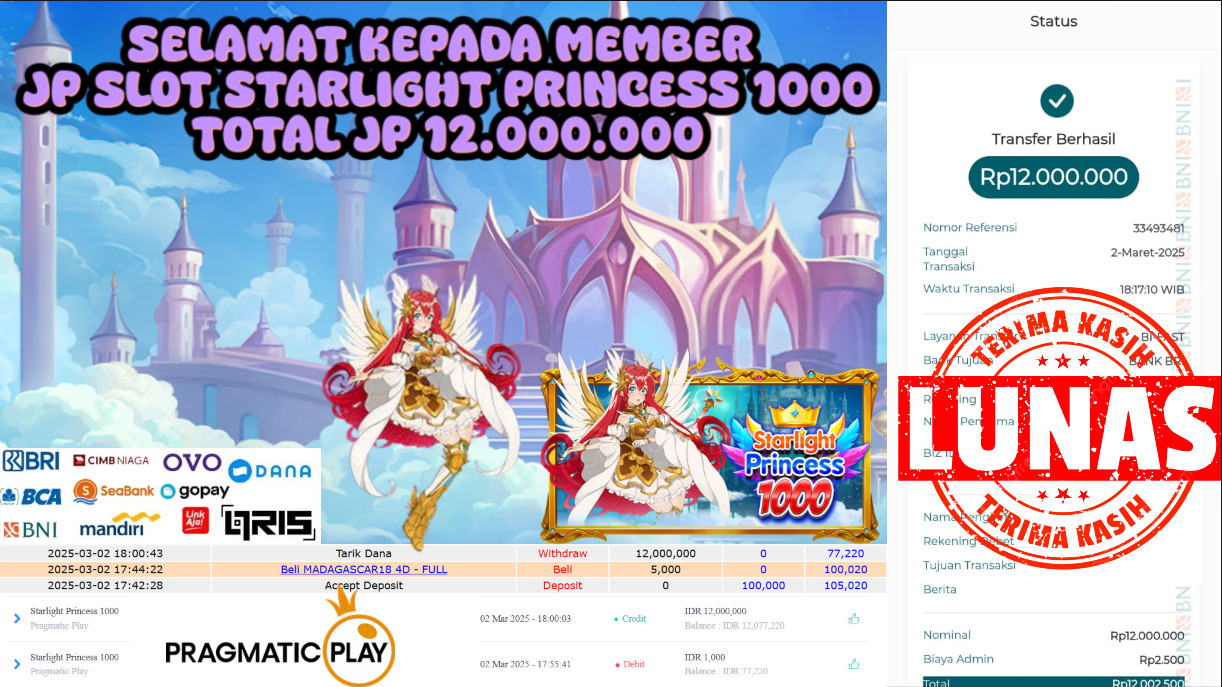 Selamat kepada member NICETOGEL User id : Tuijh** Telah berhasil mendapatkan kemenangan besar pada permainan SLOT STARLIGHT PRINCES 1000 Dengan kemenangan Sebesar Rp.12.000.000,- Setelah mengisi formulir withdraw dengan kurung waktu hanya 5 – 10 menit pihak NICETOGEL sudah melakukan transfer kepada pemilik Userid dan dana sudah dapat di cairkan oleh pemenang. Bukti pembayaran yang kami berikan merupakan bukti pembayaran yang SAH / VALID yang langung di dapatkan melaui tanda transfer transaksi dari Bank yang di tuju.