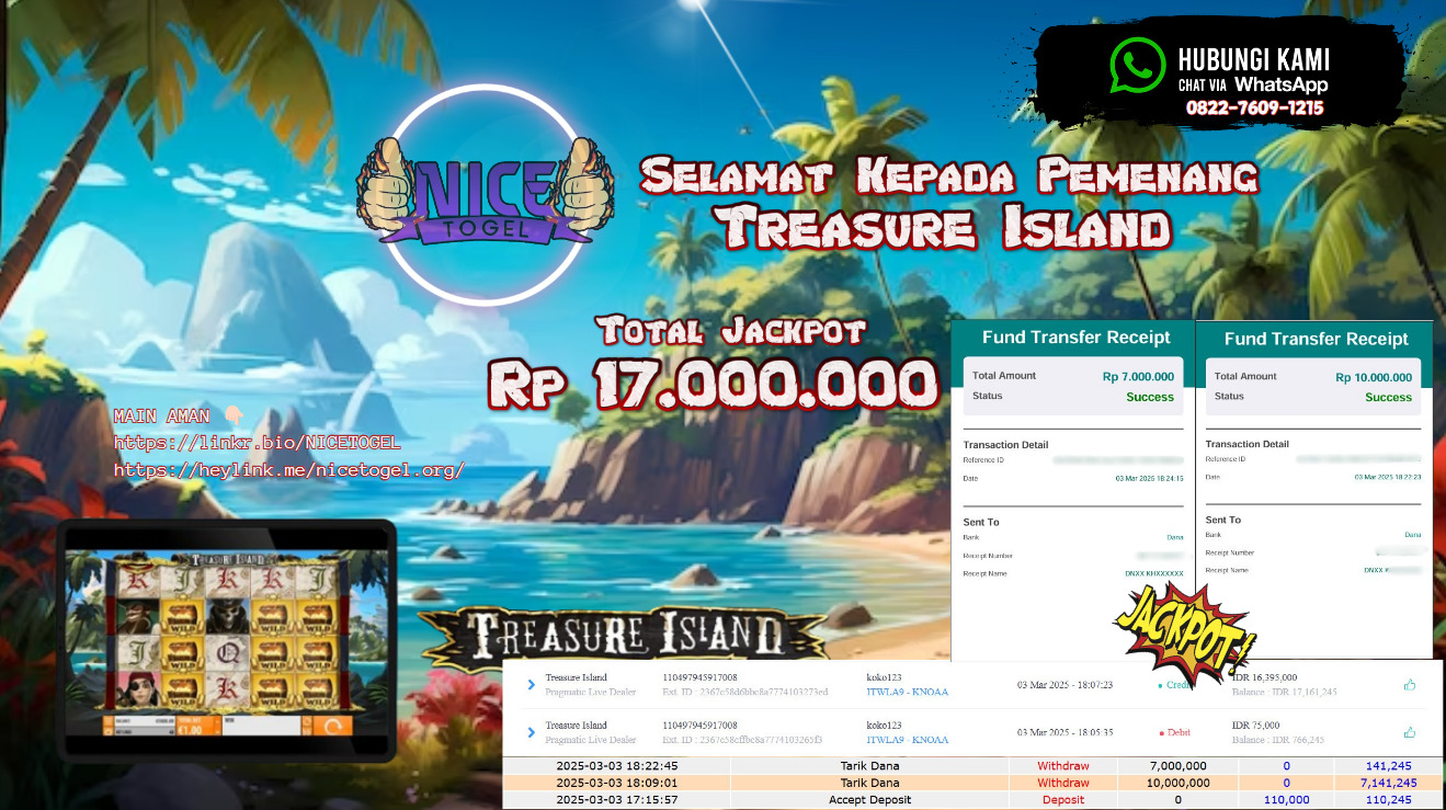 Selamat kepada member NICETOGEL User id : Dedee5** Telah berhasil mendapatkan kemenangan besar pada permainan SLOT TREASURE ISLAND Dengan kemenangan Sebesar Rp.17.000.000,- Setelah mengisi formulir withdraw dengan kurung waktu hanya 5 – 10 menit pihak NICETOGEL sudah melakukan transfer kepada pemilik Userid dan dana sudah dapat di cairkan oleh pemenang. Bukti pembayaran yang kami berikan merupakan bukti pembayaran yang SAH / VALID yang langung di dapatkan melaui tanda transfer transaksi dari Bank yang di tuju.