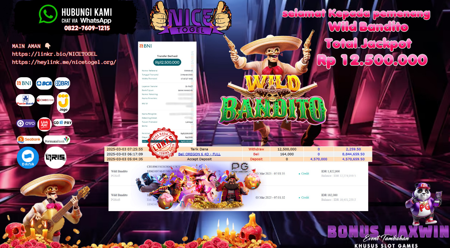 Selamat kepada member NICETOGEL User id : Poree577** Telah berhasil mendapatkan kemenangan besar pada permainan SLOT WILD BANDITO Dengan kemenangan Sebesar Rp.12.500.000,- Setelah mengisi formulir withdraw dengan kurung waktu hanya 5 – 10 menit pihak NICETOGEL sudah melakukan transfer kepada pemilik Userid dan dana sudah dapat di cairkan oleh pemenang. Bukti pembayaran yang kami berikan merupakan bukti pembayaran yang SAH / VALID yang langung di dapatkan melaui tanda transfer transaksi dari Bank yang di tuju.