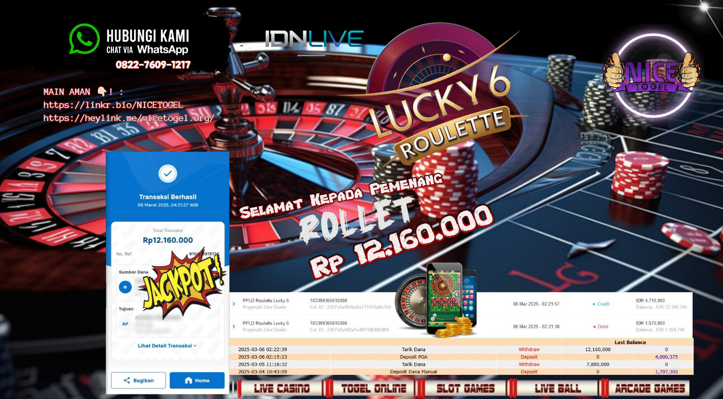 Selamat kepada member NICETOGEL User id : Ratu77** Telah berhasil mendapatkan kemenangan besar pada permainan JACKPOT ROULETTE LUCKY 6 Dengan kemenangan Sebesar Rp.12.160.000,- Setelah mengisi formulir withdraw dengan kurung waktu hanya 5 – 10 menit pihak NICETOGEL sudah melakukan transfer kepada pemilik Userid dan dana sudah dapat di cairkan oleh pemenang. Bukti pembayaran yang kami berikan merupakan bukti pembayaran yang SAH / VALID yang langung di dapatkan melaui tanda transfer transaksi dari Bank yang di tuju.