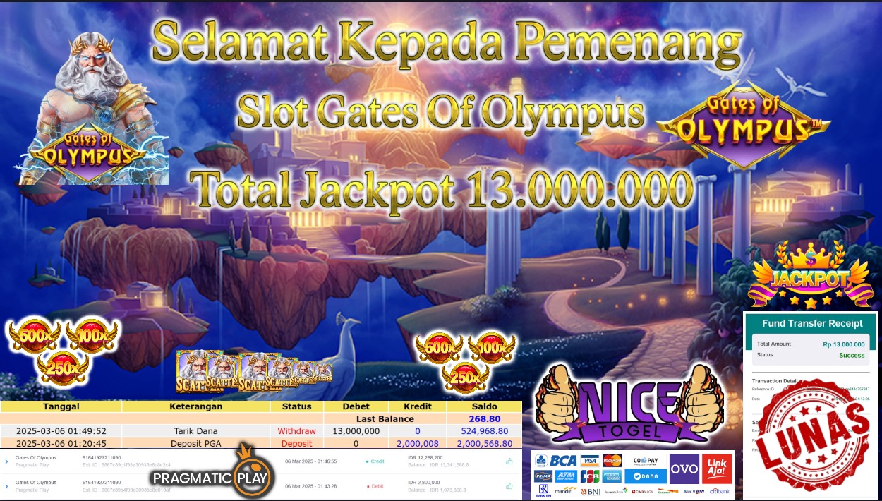 Selamat kepada member NICETOGEL User id : Riz** Telah berhasil mendapatkan kemenangan besar pada permainan SLOT GATES OF OLYMPUS 1000 Dengan kemenangan Sebesar Rp.13.000.000,- Setelah mengisi formulir withdraw dengan kurung waktu hanya 5 – 10 menit pihak NICETOGEL sudah melakukan transfer kepada pemilik Userid dan dana sudah dapat di cairkan oleh pemenang. Bukti pembayaran yang kami berikan merupakan bukti pembayaran yang SAH / VALID yang langung di dapatkan melaui tanda transfer transaksi dari Bank yang di tuju.