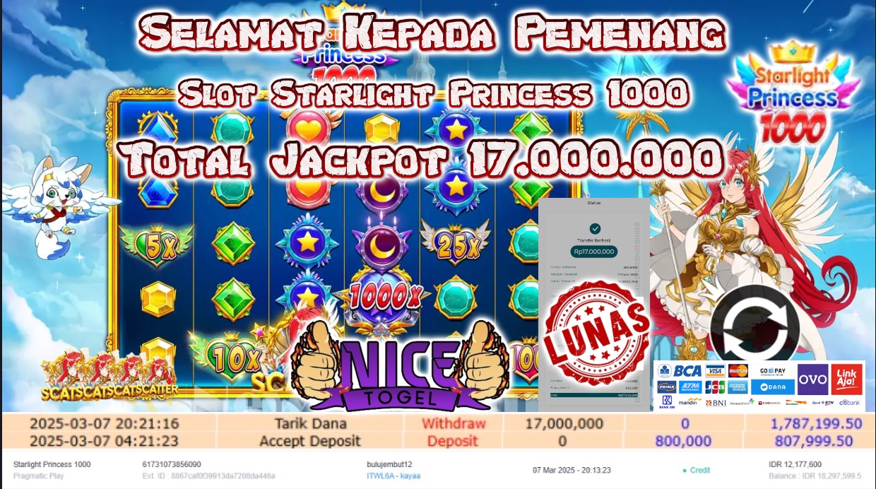 Selamat kepada member NICETOGEL User id : ASYU** Telah berhasil mendapatkan kemenangan besar pada permainan SLOT STARLIGHT PRINCES 1000 Dengan kemenangan Sebesar Rp.17.000.000,- Setelah mengisi formulir withdraw dengan kurung waktu hanya 5 – 10 menit pihak NICETOGEL sudah melakukan transfer kepada pemilik Userid dan dana sudah dapat di cairkan oleh pemenang. Bukti pembayaran yang kami berikan merupakan bukti pembayaran yang SAH / VALID yang langung di dapatkan melaui tanda transfer transaksi dari Bank yang di tuju.