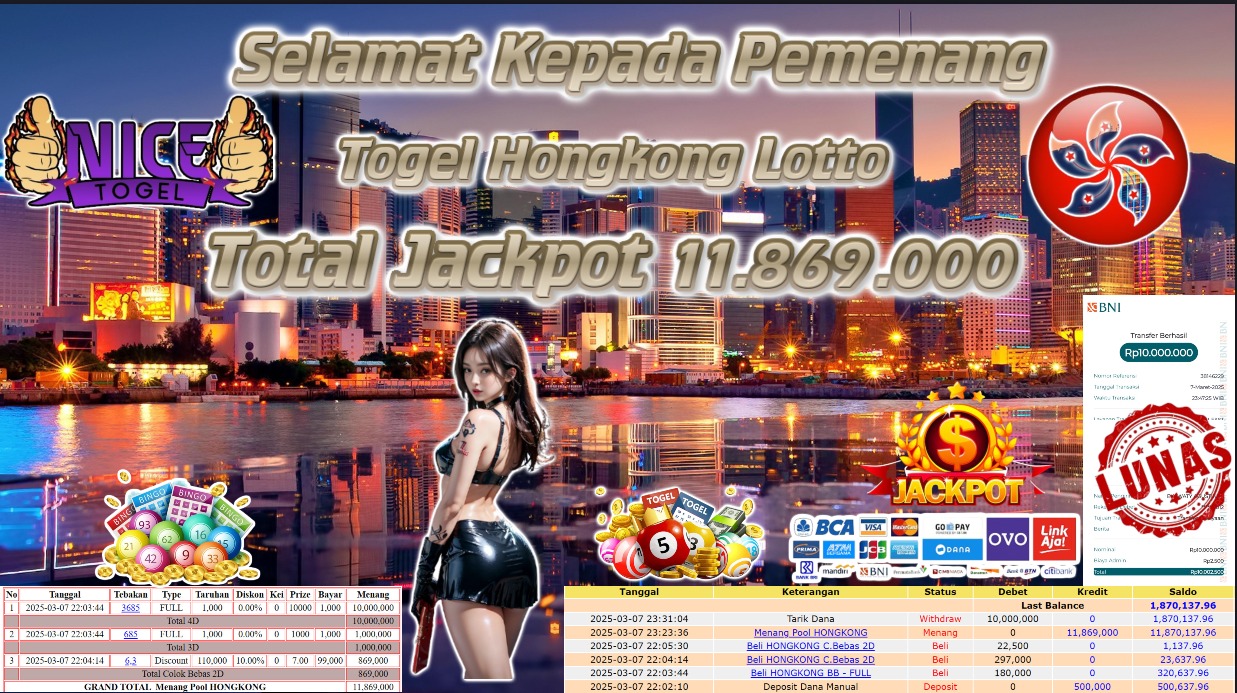 Selamat kepada member NICETOGEL User id : RESAE** Telah berhasil mendapatkan kemenangan besar pada permainan TOGEL HONGKONG LOTTO Dengan kemenangan Sebesar Rp.11.869.000,- Setelah mengisi formulir withdraw dengan kurung waktu hanya 5 – 10 menit pihak NICETOGEL sudah melakukan transfer kepada pemilik Userid dan dana sudah dapat di cairkan oleh pemenang. Bukti pembayaran yang kami berikan merupakan bukti pembayaran yang SAH / VALID yang langung di dapatkan melaui tanda transfer transaksi dari Bank yang di tuju.