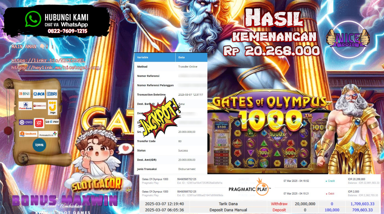 Selamat kepada member NICETOGEL User id : Poit** Telah berhasil mendapatkan kemenangan besar pada permainan SLOT GATES OF OLYMPUS 1000 Dengan kemenangan Sebesar Rp.20.268.000,- Setelah mengisi formulir withdraw dengan kurung waktu hanya 5 – 10 menit pihak NICETOGEL sudah melakukan transfer kepada pemilik Userid dan dana sudah dapat di cairkan oleh pemenang. Bukti pembayaran yang kami berikan merupakan bukti pembayaran yang SAH / VALID yang langung di dapatkan melaui tanda transfer transaksi dari Bank yang di tuju.