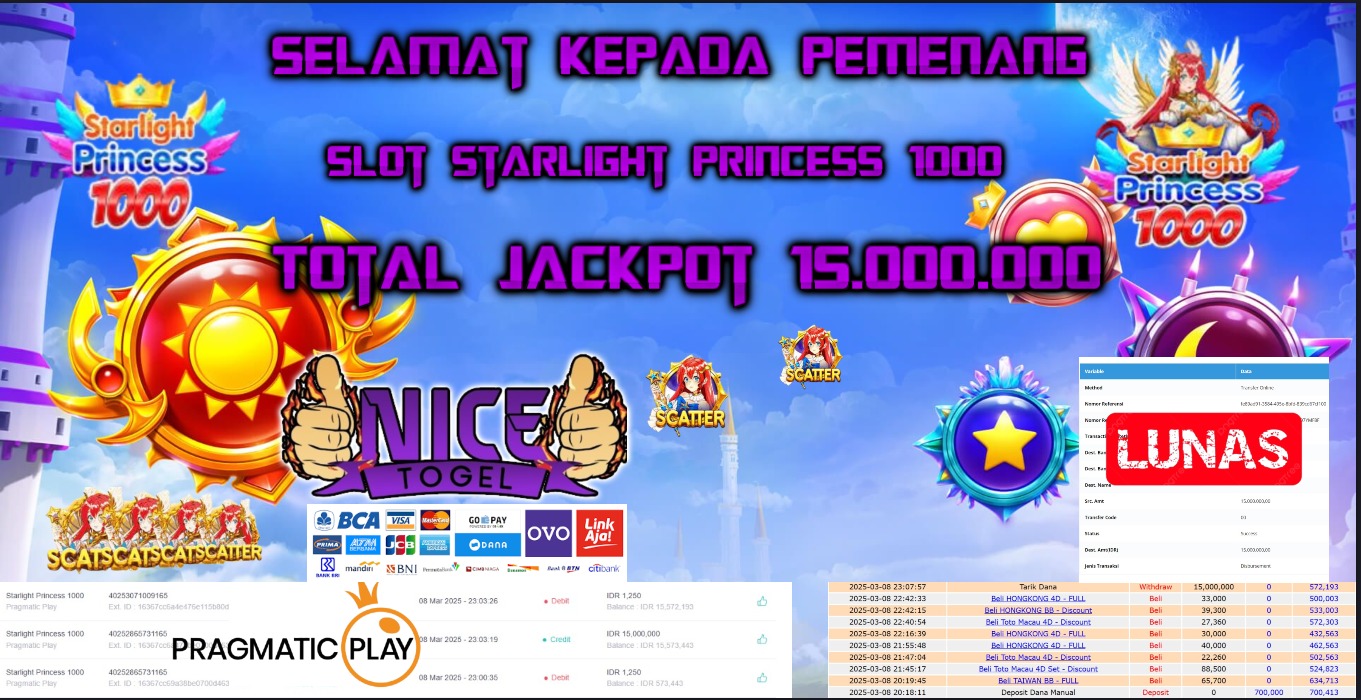 Selamat kepada member NICETOGEL User id : WERRU** Telah berhasil mendapatkan kemenangan besar pada permainan SLOT STARLIGHT PRINCESS 1000 Dengan kemenangan Sebesar Rp.15.000.000,- Setelah mengisi formulir withdraw dengan kurung waktu hanya 5 – 10 menit pihak NICETOGEL sudah melakukan transfer kepada pemilik Userid dan dana sudah dapat di cairkan oleh pemenang. Bukti pembayaran yang kami berikan merupakan bukti pembayaran yang SAH / VALID yang langung di dapatkan melaui tanda transfer transaksi dari Bank yang di tuju.