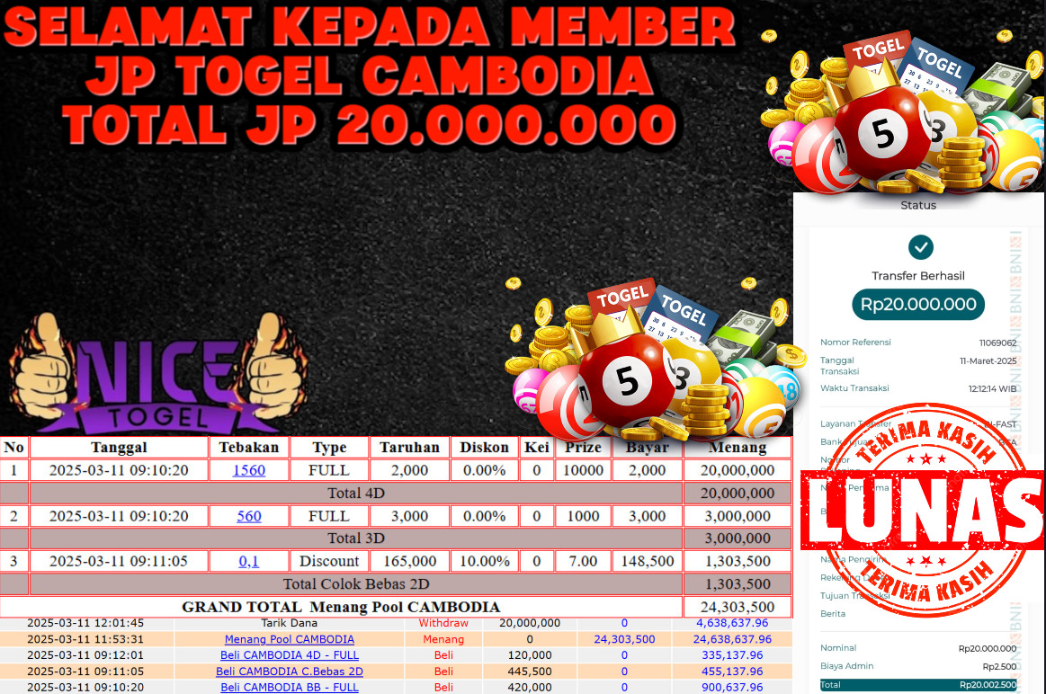 Selamat kepada member NICETOGEL User id : Ewer** Telah berhasil mendapatkan kemenangan besar pada permainan TOGEL CAMBODIA POOLS Dengan kemenangan Sebesar Rp.20.000.000,- Setelah mengisi formulir withdraw dengan kurung waktu hanya 5 – 10 menit pihak NICETOGEL sudah melakukan transfer kepada pemilik Userid dan dana sudah dapat di cairkan oleh pemenang. Bukti pembayaran yang kami berikan merupakan bukti pembayaran yang SAH / VALID yang langung di dapatkan melaui tanda transfer transaksi dari Bank yang di tuju.