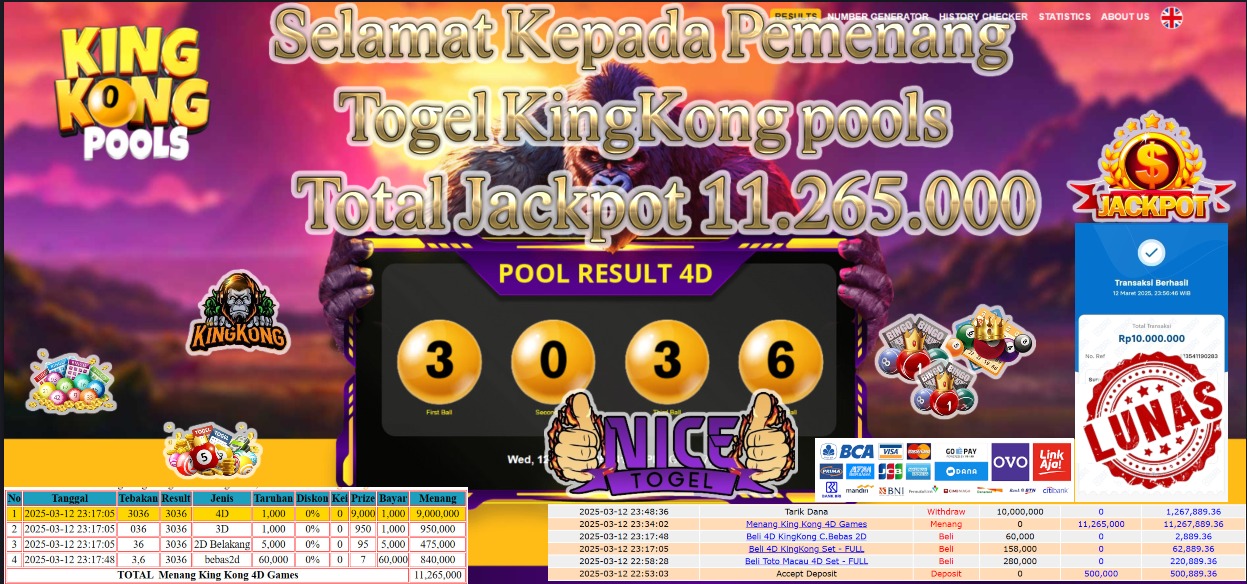 Selamat kepada member NICETOGEL User id : RUE5** Telah berhasil mendapatkan kemenangan besar pada permainan TOGEL KINGKONG 4D Dengan kemenangan Sebesar Rp.11.265.000 ,- Setelah mengisi formulir withdraw dengan kurung waktu hanya 5 – 10 menit pihak NICETOGEL sudah melakukan transfer kepada pemilik Userid dan dana sudah dapat di cairkan oleh pemenang. Bukti pembayaran yang kami berikan merupakan bukti pembayaran yang SAH / VALID yang langung di dapatkan melaui tanda transfer transaksi dari Bank yang di tuju.