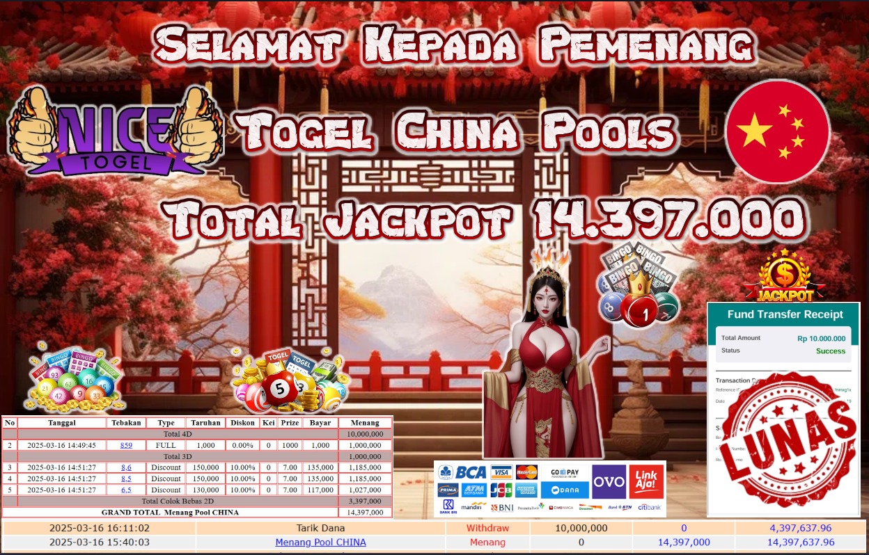 Selamat kepada member NICETOGEL User id : AZR** Telah berhasil mendapatkan kemenangan besar pada permainan TOGEL CHINA POOLS Dengan kemenangan Sebesar Rp.14.397.000,- Setelah mengisi formulir withdraw dengan kurung waktu hanya 5 – 10 menit pihak NICETOGEL sudah melakukan transfer kepada pemilik Userid dan dana sudah dapat di cairkan oleh pemenang. Bukti pembayaran yang kami berikan merupakan bukti pembayaran yang SAH / VALID yang langung di dapatkan melaui tanda transfer transaksi dari Bank yang di tuju.
