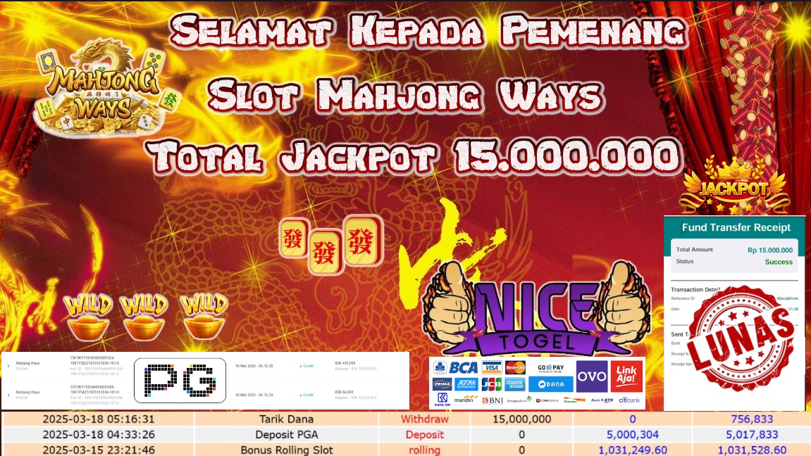 Selamat kepada member NICETOGEL User id : lop** Telah berhasil mendapatkan kemenangan besar pada permainan SLOT MAHJONG WAYS Dengan kemenangan Sebesar Rp.15.000.000,- Setelah mengisi formulir withdraw dengan kurung waktu hanya 5 – 10 menit pihak NICETOGEL sudah melakukan transfer kepada pemilik Userid dan dana sudah dapat di cairkan oleh pemenang. Bukti pembayaran yang kami berikan merupakan bukti pembayaran yang SAH / VALID yang langung di dapatkan melaui tanda transfer transaksi dari Bank yang di tuju.