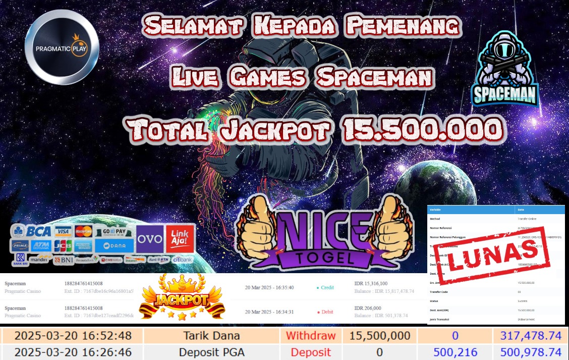 Selamat kepada member NICETOGEL User id :KAKA** Telah berhasil mendapatkan kemenangan besar pada permainan LIVE GAMES SPACEMAN Dengan kemenangan Sebesar Rp.15.500.000,- Setelah mengisi formulir withdraw dengan kurung waktu hanya 5 – 10 menit pihak NICETOGEL sudah melakukan transfer kepada pemilik Userid dan dana sudah dapat di cairkan oleh pemenang. Bukti pembayaran yang kami berikan merupakan bukti pembayaran yang SAH / VALID yang langung di dapatkan melaui tanda transfer transaksi dari Bank yang di tuju.