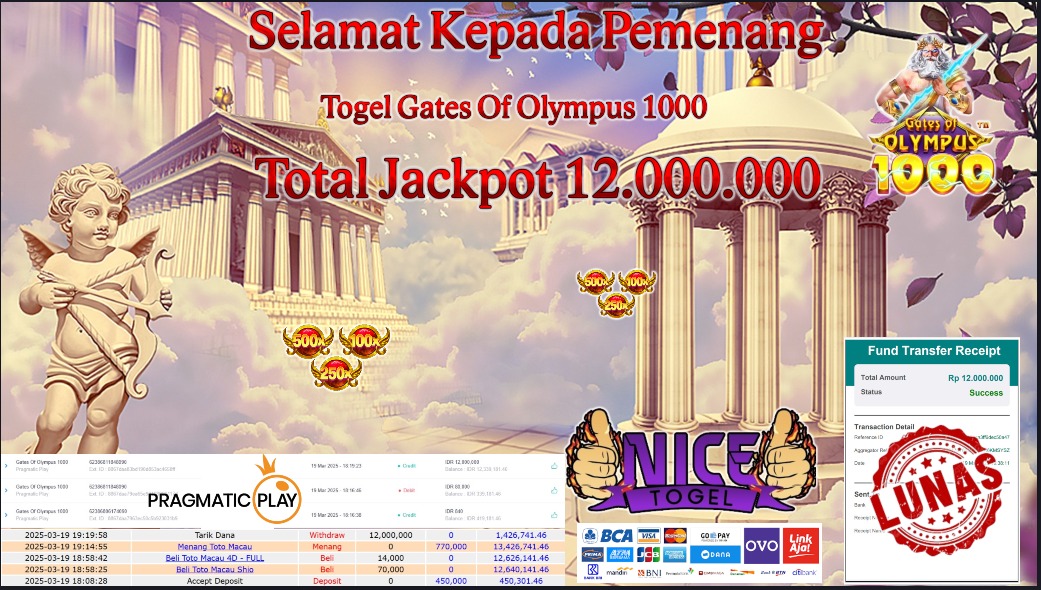 Selamat kepada member NICETOGEL User id :KUT** Telah berhasil mendapatkan kemenangan besar pada permainan SLOT GATES OF OLYMPUS 1000 Dengan kemenangan Sebesar Rp.12.000.000,- Setelah mengisi formulir withdraw dengan kurung waktu hanya 5 – 10 menit pihak NICETOGEL sudah melakukan transfer kepada pemilik Userid dan dana sudah dapat di cairkan oleh pemenang. Bukti pembayaran yang kami berikan merupakan bukti pembayaran yang SAH / VALID yang langung di dapatkan melaui tanda transfer transaksi dari Bank yang di tuju.