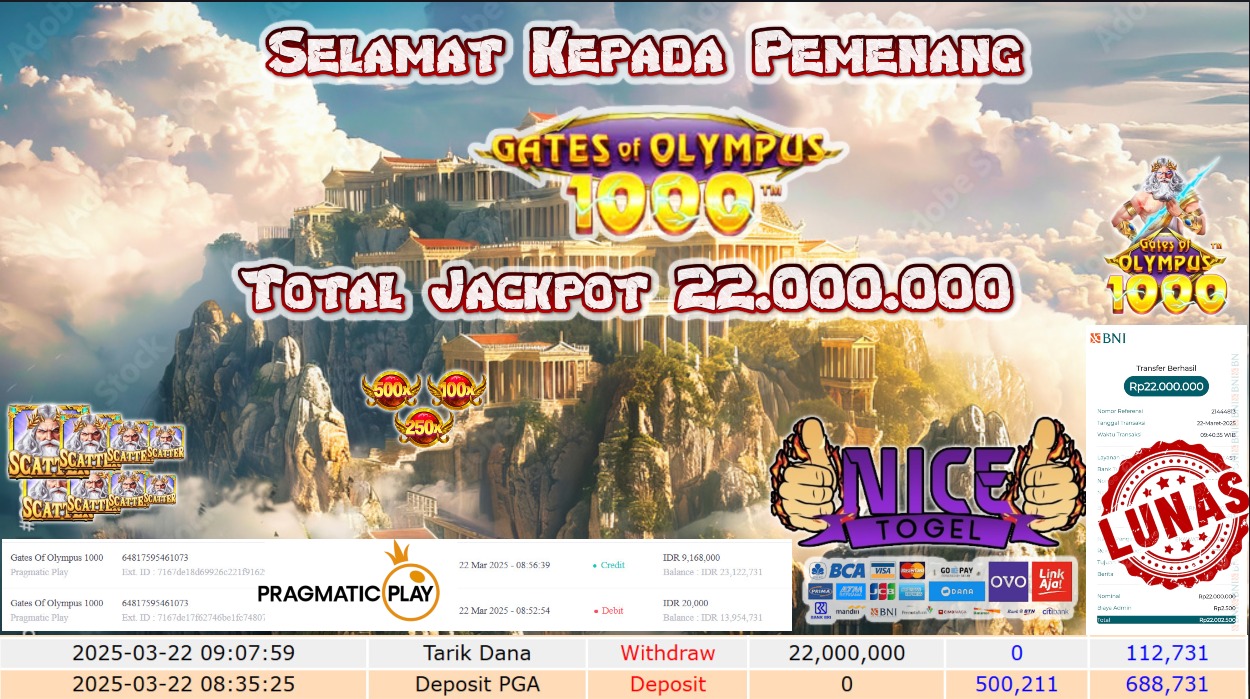Selamat kepada member NICETOGEL User id :BABE** Telah berhasil mendapatkan kemenangan besar pada permainan SLOT GATES OF OLYMPUS 1000 Dengan kemenangan Sebesar Rp.22.000.000,- Setelah mengisi formulir withdraw dengan kurung waktu hanya 5 – 10 menit pihak NICETOGEL sudah melakukan transfer kepada pemilik Userid dan dana sudah dapat di cairkan oleh pemenang. Bukti pembayaran yang kami berikan merupakan bukti pembayaran yang SAH / VALID yang langung di dapatkan melaui tanda transfer transaksi dari Bank yang di tuju.