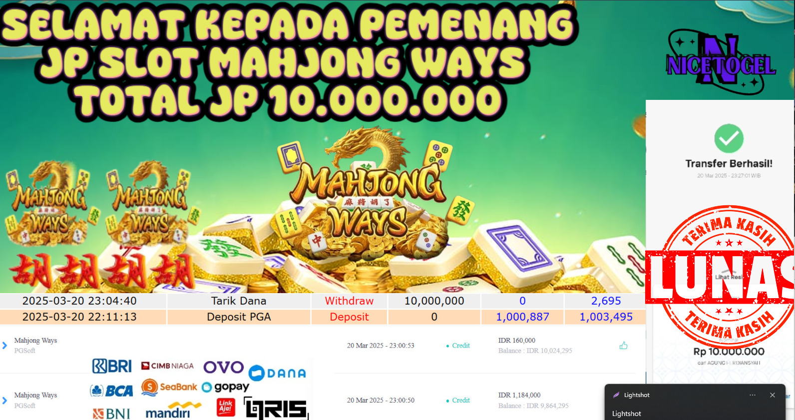 Selamat kepada member NICETOGEL User id :SAER** Telah berhasil mendapatkan kemenangan besar pada permainan SLOT MAHJONG WAYS Dengan kemenangan Sebesar Rp.10.000.0000,- Setelah mengisi formulir withdraw dengan kurung waktu hanya 5 – 10 menit pihak NICETOGEL sudah melakukan transfer kepada pemilik Userid dan dana sudah dapat di cairkan oleh pemenang. Bukti pembayaran yang kami berikan merupakan bukti pembayaran yang SAH / VALID yang langung di dapatkan melaui tanda transfer transaksi dari Bank yang di tuju.