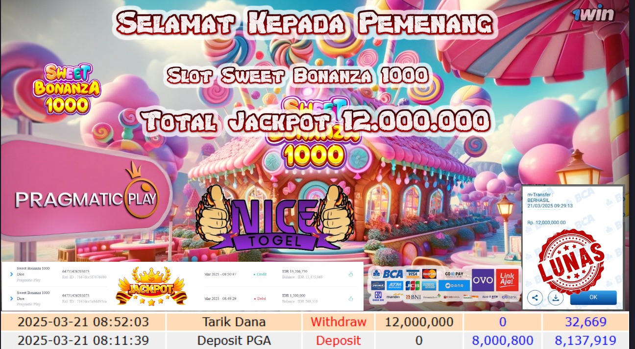 Selamat kepada member NICETOGEL User id :AER** Telah berhasil mendapatkan kemenangan besar pada permainan SLOT SWEET BONANZA 1000 Dengan kemenangan Sebesar Rp.12.000.000,- Setelah mengisi formulir withdraw dengan kurung waktu hanya 5 – 10 menit pihak NICETOGEL sudah melakukan transfer kepada pemilik Userid dan dana sudah dapat di cairkan oleh pemenang. Bukti pembayaran yang kami berikan merupakan bukti pembayaran yang SAH / VALID yang langung di dapatkan melaui tanda transfer transaksi dari Bank yang di tuju.