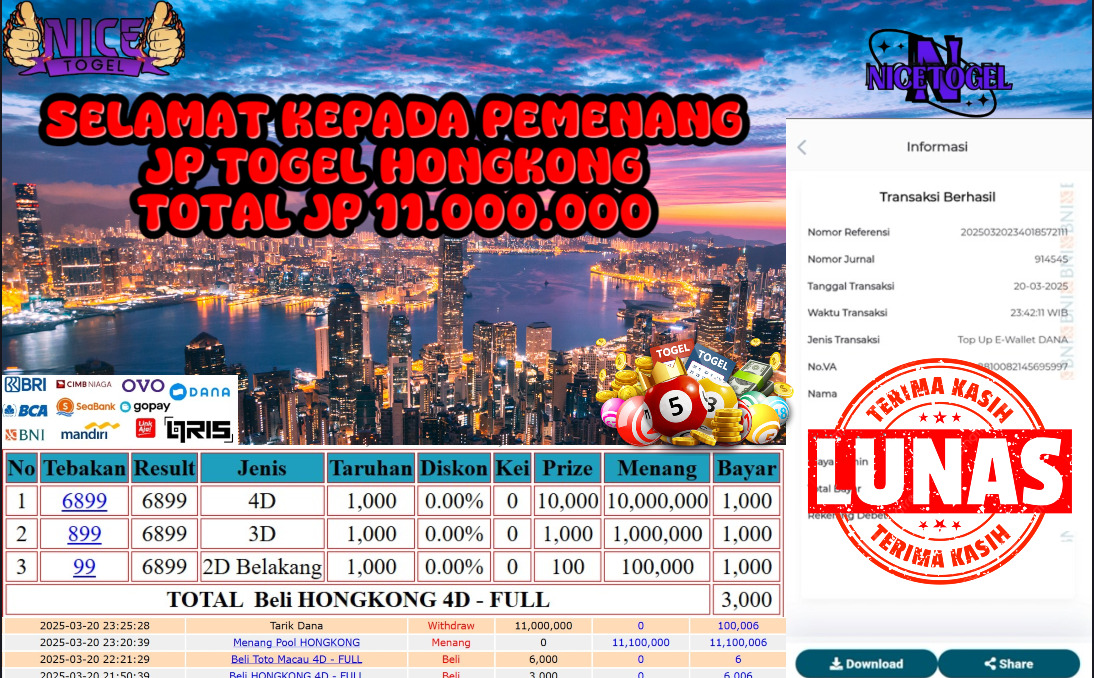 Selamat kepada member NICETOGEL User id :ALAS** Telah berhasil mendapatkan kemenangan besar pada permainan TOGEL HONGKONG Dengan kemenangan Sebesar Rp.11.000.000,- Setelah mengisi formulir withdraw dengan kurung waktu hanya 5 – 10 menit pihak NICETOGEL sudah melakukan transfer kepada pemilik Userid dan dana sudah dapat di cairkan oleh pemenang. Bukti pembayaran yang kami berikan merupakan bukti pembayaran yang SAH / VALID yang langung di dapatkan melaui tanda transfer transaksi dari Bank yang di tuju.