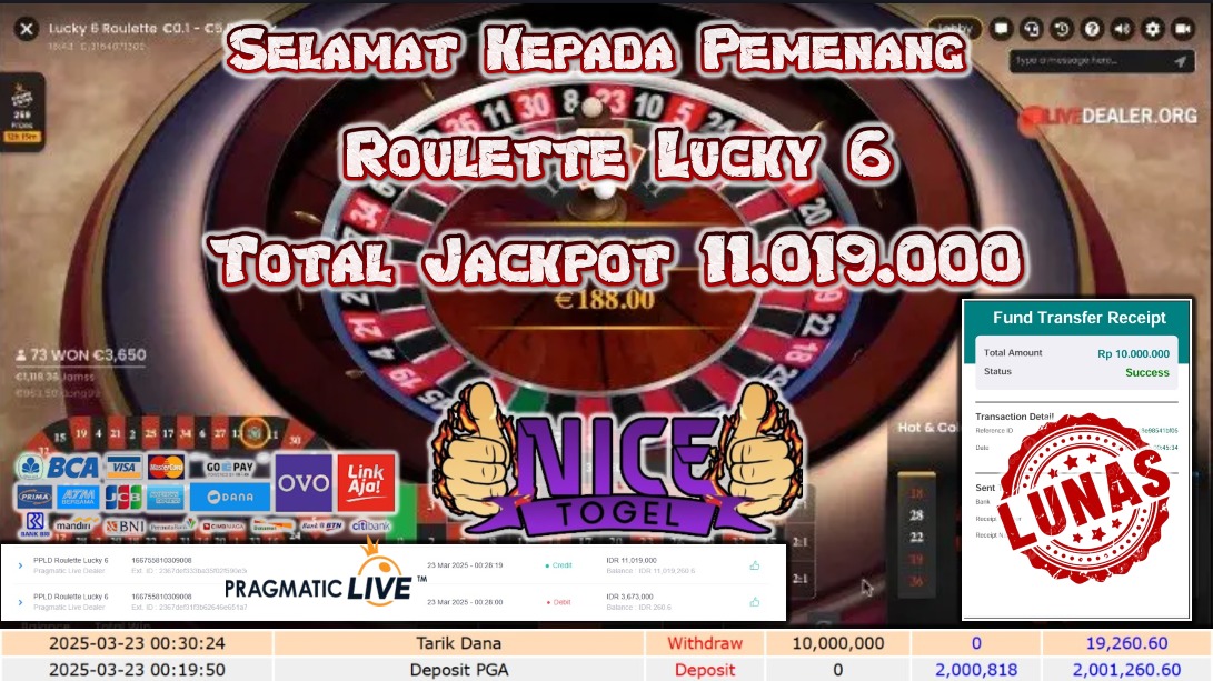 Selamat kepada member NICETOGEL User id :TUC** Telah berhasil mendapatkan kemenangan besar pada permainan BUKTI JACKPOT LIVE GAME ROULLET LUCKY 6 Rp 11.019.000,- LUNAS Dengan kemenangan Sebesar Rp.11.019.000,- Setelah mengisi formulir withdraw dengan kurung waktu hanya 5 – 10 menit pihak NICETOGEL sudah melakukan transfer kepada pemilik Userid dan dana sudah dapat di cairkan oleh pemenang. Bukti pembayaran yang kami berikan merupakan bukti pembayaran yang SAH / VALID yang langung di dapatkan melaui tanda transfer transaksi dari Bank yang di tuju.