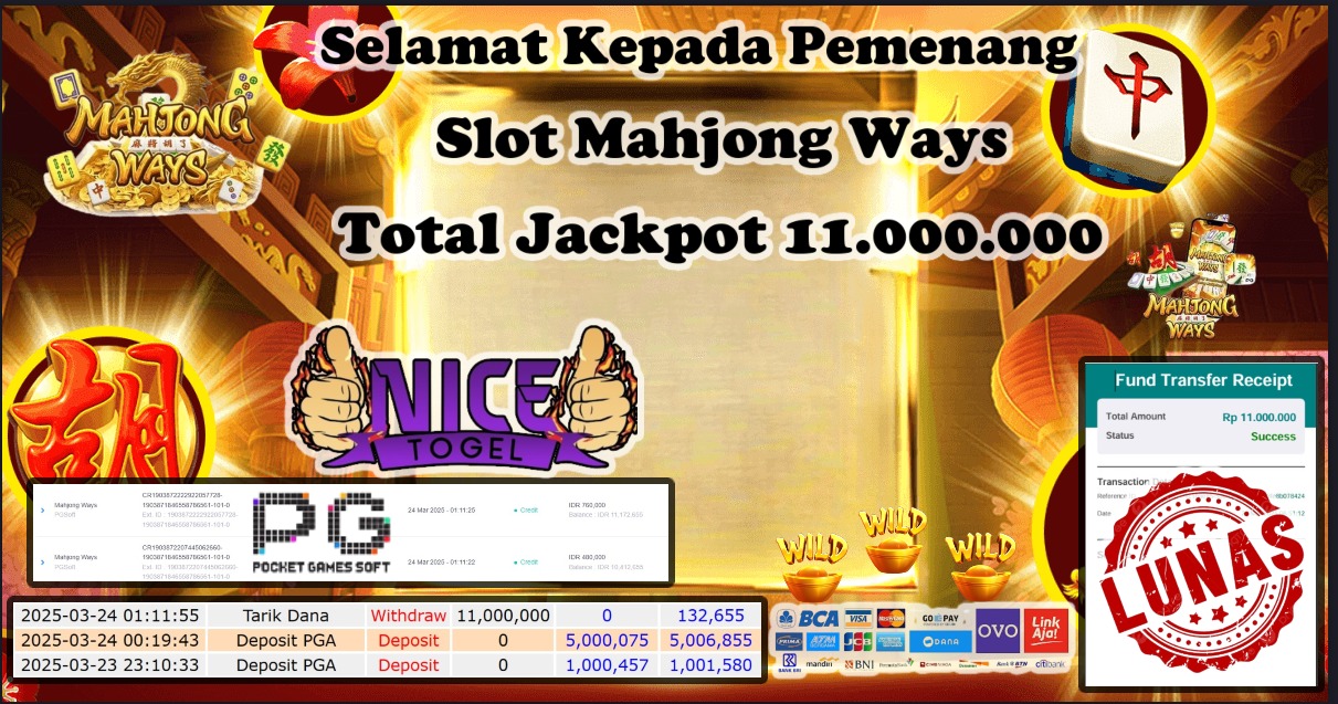 Selamat kepada member NICETOGEL User id :JAKE** Telah berhasil mendapatkan kemenangan besar pada permainan SLOT MAHJONG WAYS Dengan kemenangan Sebesar Rp.11.000.000,- Setelah mengisi formulir withdraw dengan kurung waktu hanya 5 – 10 menit pihak NICETOGEL sudah melakukan transfer kepada pemilik Userid dan dana sudah dapat di cairkan oleh pemenang. Bukti pembayaran yang kami berikan merupakan bukti pembayaran yang SAH / VALID yang langung di dapatkan melaui tanda transfer transaksi dari Bank yang di tuju.