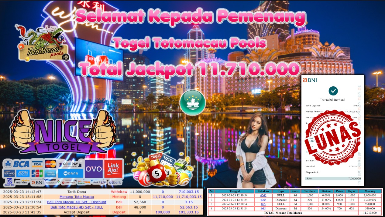 Selamat kepada member NICETOGEL User id :RUA** Telah berhasil mendapatkan kemenangan besar pada permainan TOGEL TOTO MACAU Dengan kemenangan Sebesar Rp.11.710.000,- Setelah mengisi formulir withdraw dengan kurung waktu hanya 5 – 10 menit pihak NICETOGEL sudah melakukan transfer kepada pemilik Userid dan dana sudah dapat di cairkan oleh pemenang. Bukti pembayaran yang kami berikan merupakan bukti pembayaran yang SAH / VALID yang langung di dapatkan melaui tanda transfer transaksi dari Bank yang di tuju.