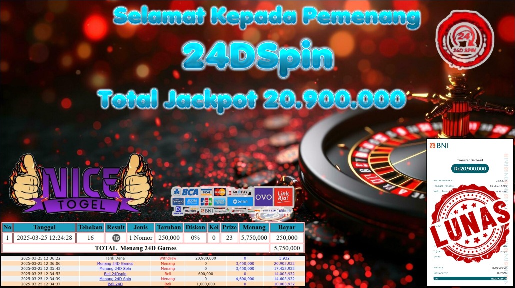 Selamat kepada member NICETOGEL User id :HOLE** Telah berhasil mendapatkan kemenangan besar pada permainan LIVE GAME 24D SPIN Dengan kemenangan Sebesar Rp.20.900.000,- Setelah mengisi formulir withdraw dengan kurung waktu hanya 5 – 10 menit pihak NICETOGEL sudah melakukan transfer kepada pemilik Userid dan dana sudah dapat di cairkan oleh pemenang. Bukti pembayaran yang kami berikan merupakan bukti pembayaran yang SAH / VALID yang langung di dapatkan melaui tanda transfer transaksi dari Bank yang di tuju.