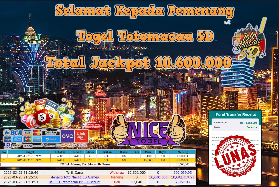 Selamat kepada member NICETOGEL User id :HAE** Telah berhasil mendapatkan kemenangan besar pada permainan TOGEL TOTO MACAU 5D Dengan kemenangan Sebesar Rp.10.600.000,- Setelah mengisi formulir withdraw dengan kurung waktu hanya 5 – 10 menit pihak NICETOGEL sudah melakukan transfer kepada pemilik Userid dan dana sudah dapat di cairkan oleh pemenang. Bukti pembayaran yang kami berikan merupakan bukti pembayaran yang SAH / VALID yang langung di dapatkan melaui tanda transfer transaksi dari Bank yang di tuju.