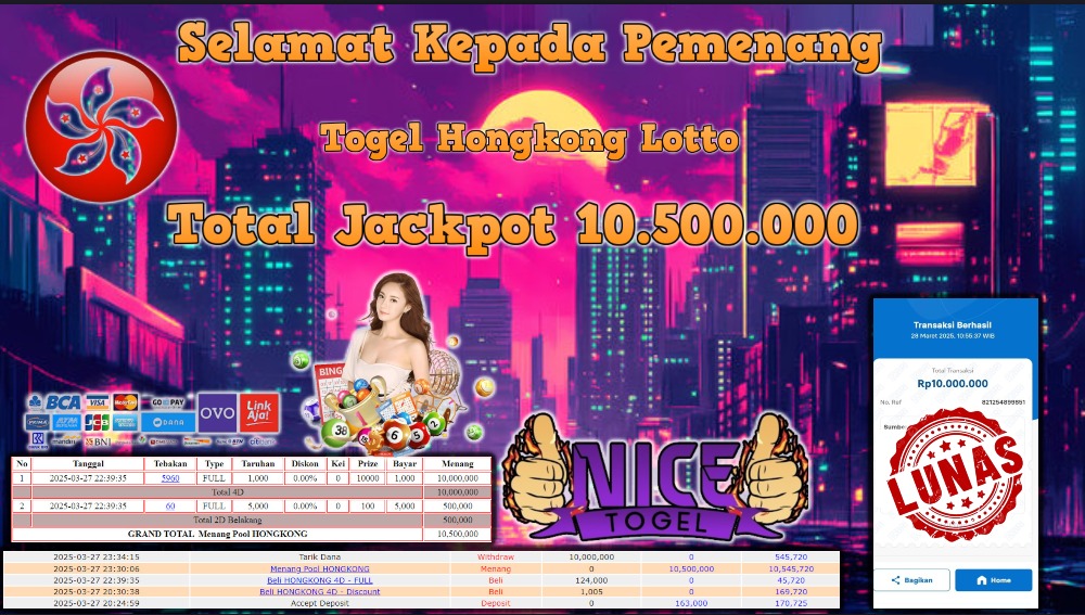 Selamat kepada member NICETOGEL User id :deff** Telah berhasil mendapatkan kemenangan besar pada permainan TOGEL HONGKONG LOTTO Dengan kemenangan Sebesar Rp.10.500.000,- Setelah mengisi formulir withdraw dengan kurung waktu hanya 5 – 10 menit pihak NICETOGEL sudah melakukan transfer kepada pemilik Userid dan dana sudah dapat di cairkan oleh pemenang. Bukti pembayaran yang kami berikan merupakan bukti pembayaran yang SAH / VALID yang langung di dapatkan melaui tanda transfer transaksi dari Bank yang di tuju.