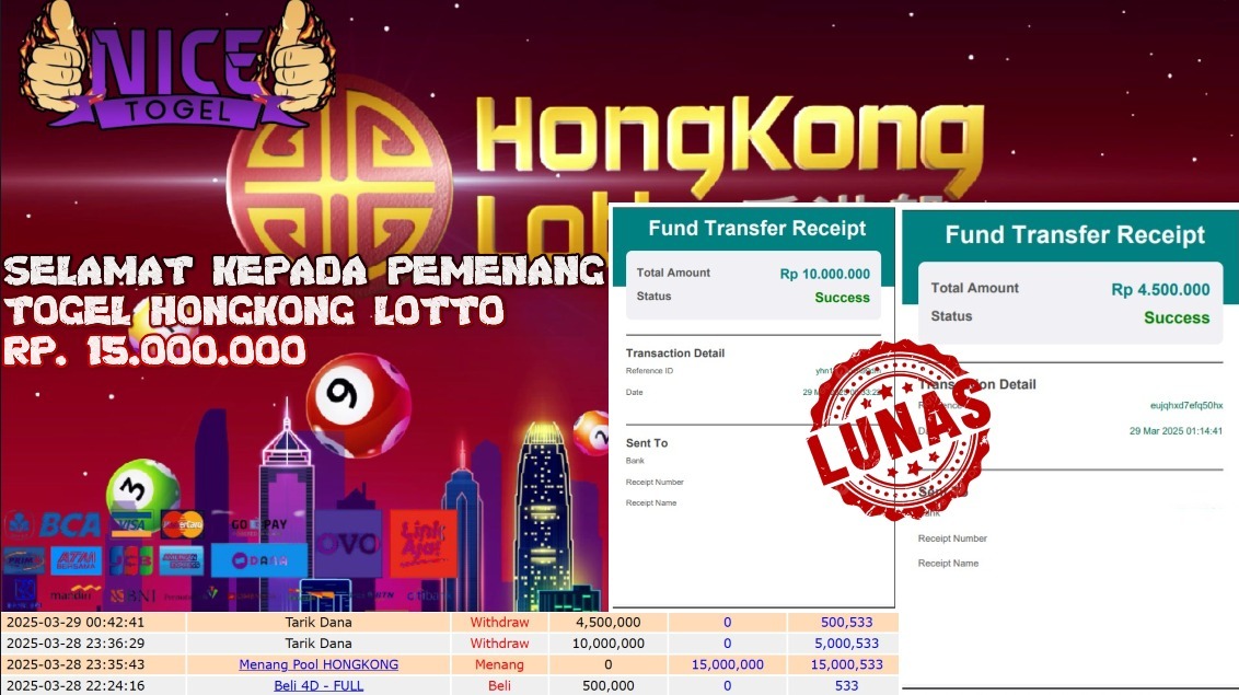Selamat kepada member NICETOGEL User id :PICAk** Telah berhasil mendapatkan kemenangan besar pada permainan TOGEL HONGKONG Dengan kemenangan Sebesar Rp.15.000.000,- Setelah mengisi formulir withdraw dengan kurung waktu hanya 5 – 10 menit pihak NICETOGEL sudah melakukan transfer kepada pemilik Userid dan dana sudah dapat di cairkan oleh pemenang. Bukti pembayaran yang kami berikan merupakan bukti pembayaran yang SAH / VALID yang langung di dapatkan melaui tanda transfer transaksi dari Bank yang di tuju.