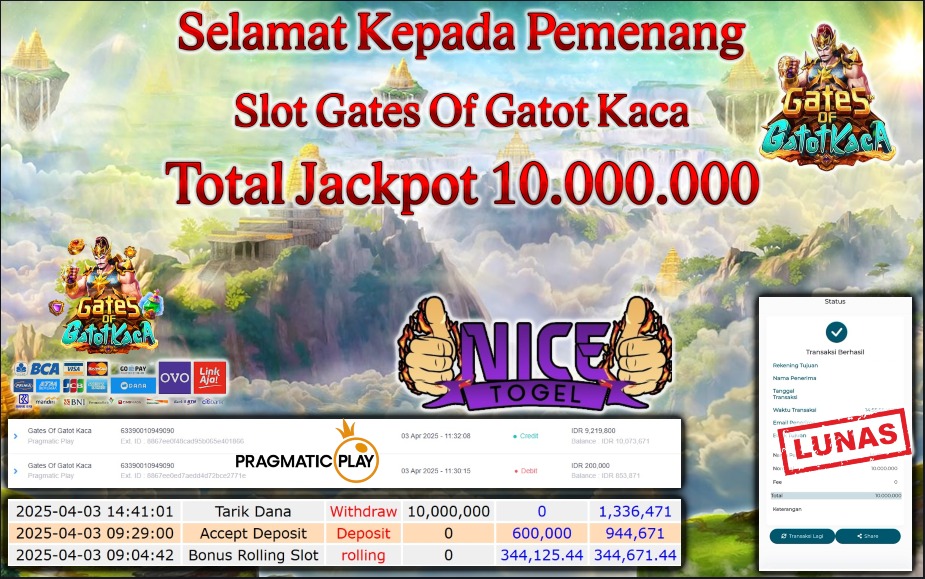 Selamat kepada member NICETOGEL User id :Rini** Telah berhasil mendapatkan kemenangan besar pada permainan SLOT GATES OF GATOT KACA Dengan kemenangan Sebesar Rp.10.000.000,- Setelah mengisi formulir withdraw dengan kurung waktu hanya 5 – 10 menit pihak NICETOGEL sudah melakukan transfer kepada pemilik Userid dan dana sudah dapat di cairkan oleh pemenang. Bukti pembayaran yang kami berikan merupakan bukti pembayaran yang SAH / VALID yang langung di dapatkan melaui tanda transfer transaksi dari Bank yang di tuju.