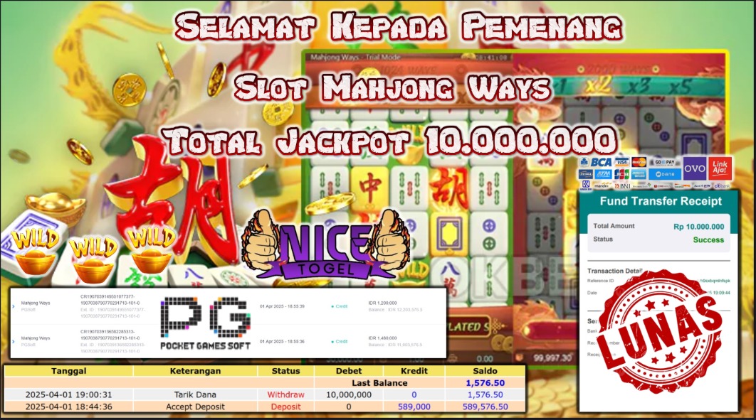 Selamat kepada member NICETOGEL User id :dedi** Telah berhasil mendapatkan kemenangan besar pada permainan SLOT MAHJONG WAYS Dengan kemenangan Sebesar Rp.10.000.000,- Setelah mengisi formulir withdraw dengan kurung waktu hanya 5 – 10 menit pihak NICETOGEL sudah melakukan transfer kepada pemilik Userid dan dana sudah dapat di cairkan oleh pemenang. Bukti pembayaran yang kami berikan merupakan bukti pembayaran yang SAH / VALID yang langung di dapatkan melaui tanda transfer transaksi dari Bank yang di tuju.