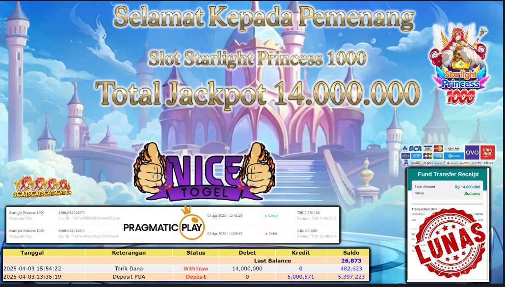 Selamat kepada member NICETOGEL User id :Pioa** Telah berhasil mendapatkan kemenangan besar pada permainan SLOT STARLIGHT PRINCESS 1000 Dengan kemenangan Sebesar Rp.14.000.000,- Setelah mengisi formulir withdraw dengan kurung waktu hanya 5 – 10 menit pihak NICETOGEL sudah melakukan transfer kepada pemilik Userid dan dana sudah dapat di cairkan oleh pemenang. Bukti pembayaran yang kami berikan merupakan bukti pembayaran yang SAH / VALID yang langung di dapatkan melaui tanda transfer transaksi dari Bank yang di tuju.