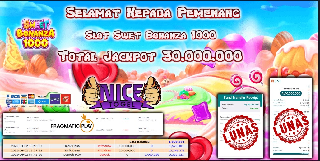 Selamat kepada member NICETOGEL User id :Tia** Telah berhasil mendapatkan kemenangan besar pada permainan SLOT SWEET BONANZA 1000 Dengan kemenangan Sebesar Rp.30.000.000,- Setelah mengisi formulir withdraw dengan kurung waktu hanya 5 – 10 menit pihak NICETOGEL sudah melakukan transfer kepada pemilik Userid dan dana sudah dapat di cairkan oleh pemenang. Bukti pembayaran yang kami berikan merupakan bukti pembayaran yang SAH / VALID yang langung di dapatkan melaui tanda transfer transaksi dari Bank yang di tuju.